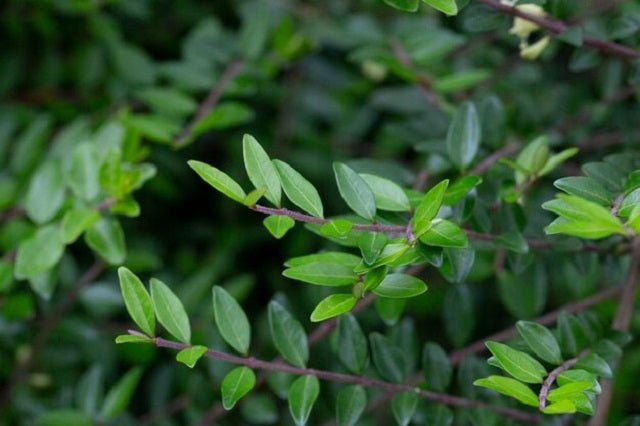 DESCRIPCIÓN VISUAL: Arbusto perenne de crecimiento extendido con hojas pequeñas, ovaladas y de color verde oscuro. Produce flores tubulares de color blanco cremoso en primavera, seguidas de bayas de color púrpura-negro.