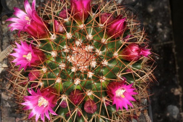 DESCRIPCIÓN VISUAL: Cactus pequeño y globular con tubérculos cónicos y areolas con espinas radiales blancas y espinas centrales más oscuras y robustas. Flores de color rojo púrpura que aparecen en la corona del cactus.