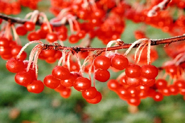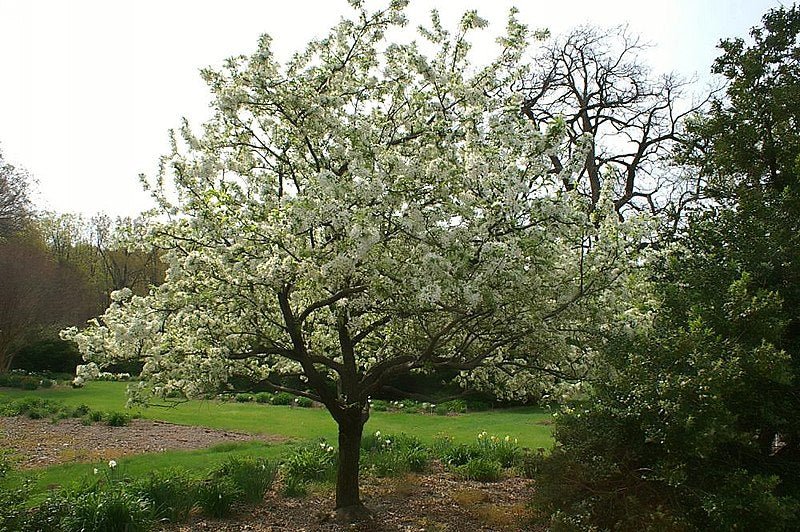 DESCRIPCIÓN VISUAL: Árbol de tamaño pequeño a mediano con una copa redondeada y hojas de color verde oscuro. Produce flores blancas o rosadas en primavera seguidas de frutos rojos pequeños.