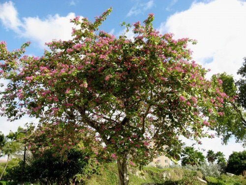 DESCRIPCIÓN VISUAL: Árbol de tamaño mediano con hojas bilobuladas que recuerdan a una huella de vaca y flores grandes de color púrpura o rosado con forma de orquídea.