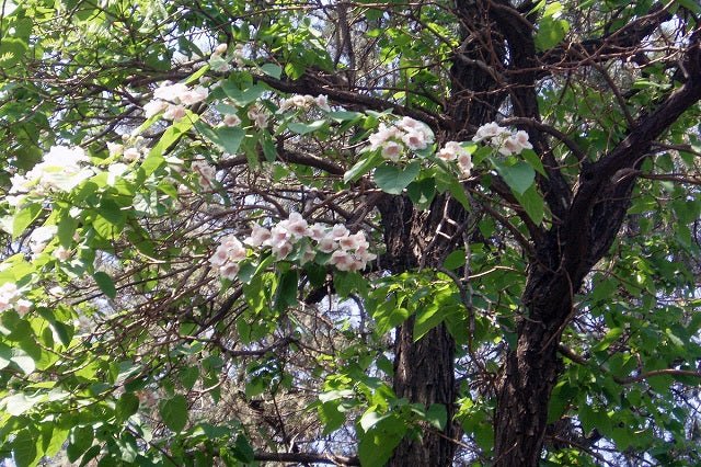 DESCRIPCIÓN VISUAL: Árbol de gran tamaño con hojas grandes, caducas y en forma de corazón. Las flores son de color lila o violeta, agrupadas en grandes panículas y aparecen antes de las hojas en primavera. La corteza es gris y se desprende en placas con la edad.