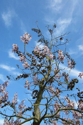 Una preciosa floración de color lila claro y unas enormes hojas convierten a este verdadero parasol en uno de los árboles de mediano tamaño más deseados para un jardín. De origen chino, la Paulownia tomentosa alcanza los 15 metros de altura y un diámetro de copa de cinco a siete metros. Prefiere los climas templados, pero puede resistir los fríos intensos (-29º, zonas 5-8). Tolera la contaminación ambiental y la sequía, y puede vivir en un amplio rango de suelos. Crece rápidamente y no acusa problemas reseñables de plagas o enfermedades.