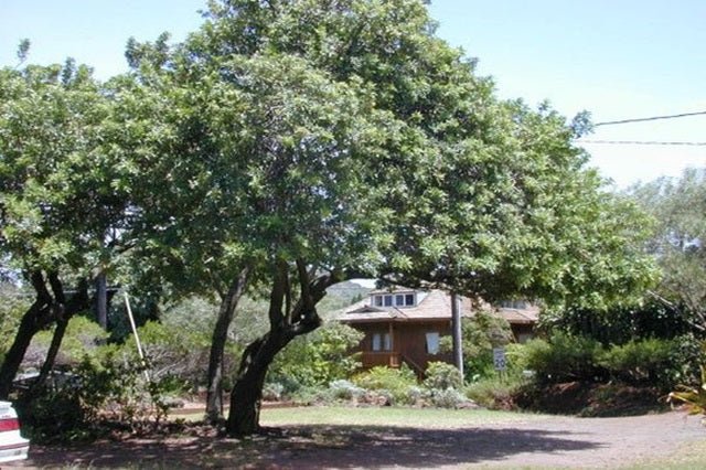 DESCRIPCIÓN VISUAL: Árbol perenne de tamaño mediano con una copa redondeada y follaje denso. Hojas compuestas, alternas, de color verde oscuro y brillante. Produce pequeñas flores blancas agrupadas en racimos, seguidas de frutos rojos en forma de drupa.