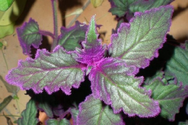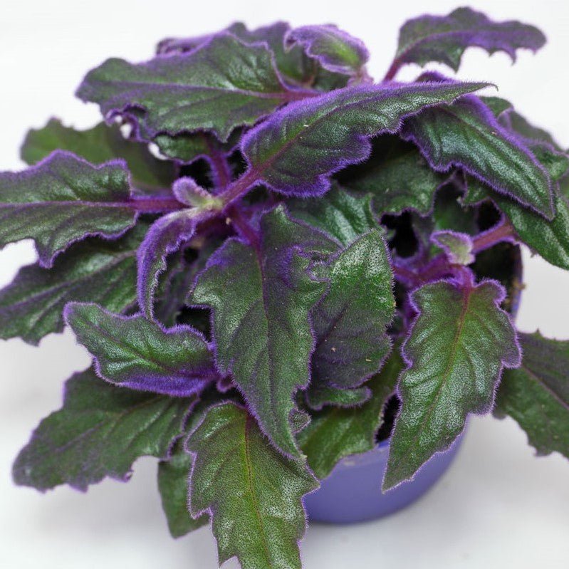 DESCRIPCIÓN VISUAL: Planta de interior con hojas suaves y aterciopeladas de color verde oscuro con tonos púrpura o naranja, dependiendo de la variedad.