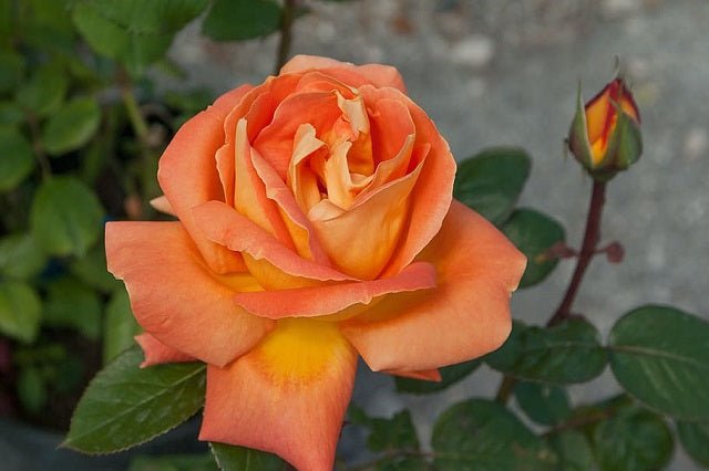 DESCRIPCIÓN VISUAL: Arbusto perenne con tallos espinosos y hojas compuestas, de color verde oscuro. Las flores son de un color naranja salmón intenso, grandes y con forma de copa, y desprenden un aroma suave y agradable.