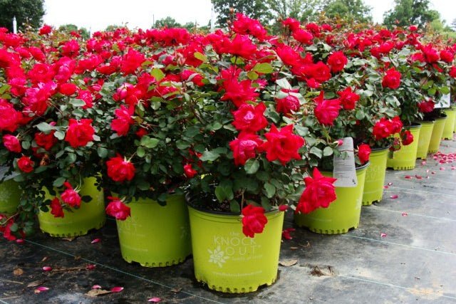 DESCRIPCIÓN VISUAL: Arbusto de rosas con flores de color rojo brillante, dobles y de tamaño mediano. Follaje verde oscuro y denso con una forma redondeada y compacta.