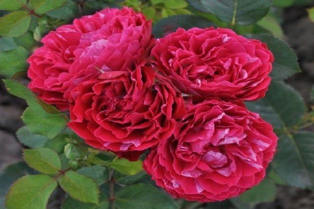 DESCRIPCIÓN VISUAL: Arbusto perenne con tallos espinosos y hojas compuestas, verdes y brillantes. Flores grandes, dobles, de color rosa intenso con matices más claros hacia el centro.