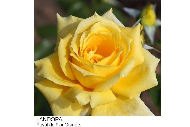 DESCRIPCIÓN VISUAL: El Rosal 'Landora' es conocido por sus flores grandes y de color amarillo intenso. Las rosas tienen una forma clásica de capullos que se abren en flores completas con numerosos pétalos. El follaje es verde oscuro y brillante, proporcionando un contraste atractivo con las flores.
