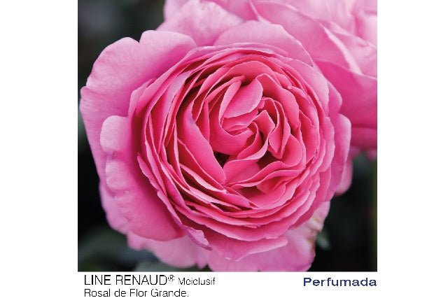 DESCRIPCIÓN VISUAL: Arbusto de rosas con flores grandes y dobles de color rosa intenso y con un perfume fuerte y afrutado. Las hojas son de color verde oscuro y brillante.