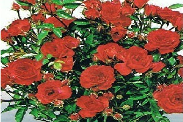 DESCRIPCIÓN VISUAL: Este rosal miniatura presenta flores pequeñas de color rojo intenso y brillante. Las flores tienen una forma clásica de rosa con múltiples capas de pétalos. El follaje es verde oscuro y brillante, y la planta tiene un hábito de crecimiento compacto y ordenado.