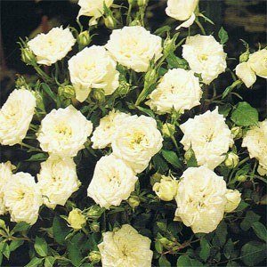 DESCRIPCIÓN VISUAL: Arbusto de rosas con flores blancas, pequeñas y agrupadas. Hojas verdes y brillantes con tallos que pueden presentar espinas.