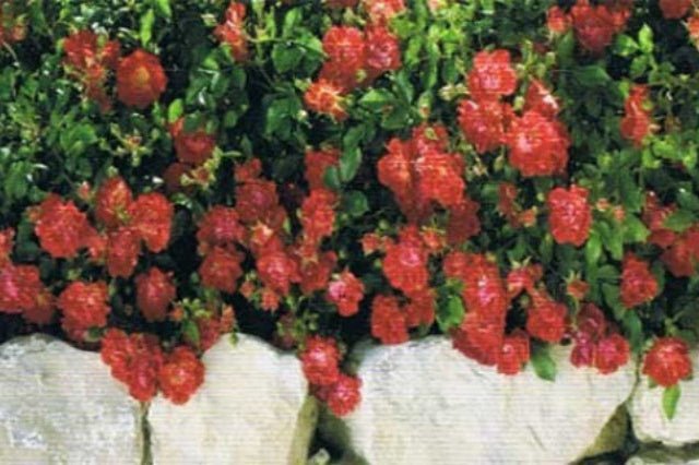 DESCRIPCIÓN VISUAL: Arbusto de rosas con flores de color rosa intenso y brillante, con hojas verdes oscuras y una forma redondeada y compacta.