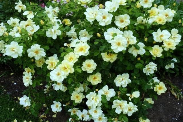 DESCRIPCIÓN VISUAL: Este rosal es conocido por sus flores de color amarillo brillante que se van aclarando a crema con el tiempo. Tiene un hábito de crecimiento compacto y arbustivo, con follaje verde oscuro y brillante.