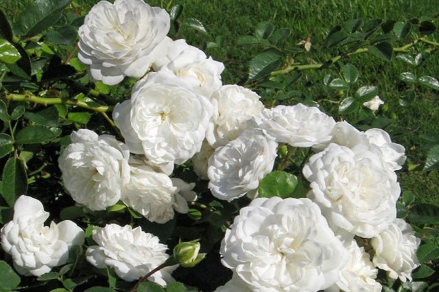 DESCRIPCIÓN VISUAL: Este rosal trepador se caracteriza por sus largos y flexibles tallos que pueden ser guiados sobre soportes. Presenta hojas pequeñas y brillantes de color verde claro. Sus flores son dobles, de color blanco puro y aparecen en racimos, desprendiendo un ligero aroma.