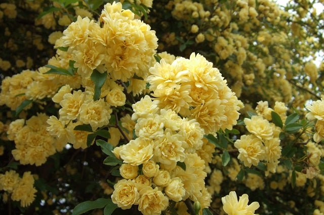 DESCRIPCIÓN VISUAL: Arbusto trepador con tallos largos y flexibles. Presenta flores dobles, pequeñas y de color amarillo claro, agrupadas en racimos. Las hojas son verdes, brillantes y compuestas por foliolos pequeños.