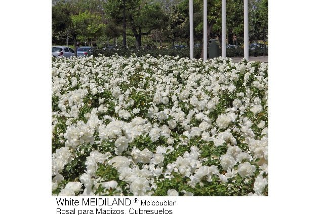 DESCRIPCIÓN VISUAL: Arbusto de rosas con flores blancas, de crecimiento extendido y follaje verde oscuro. Las flores son semi-dobles y se presentan en racimos.