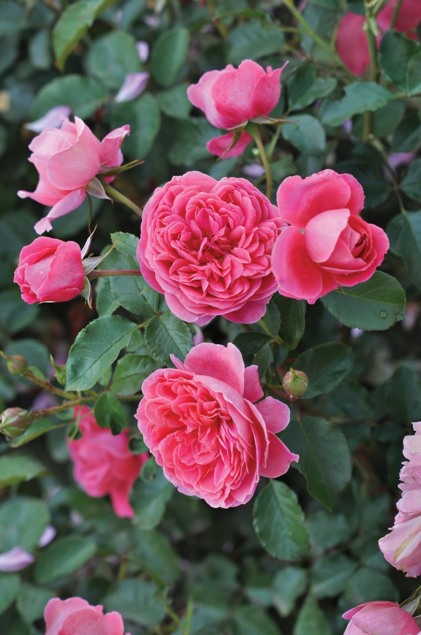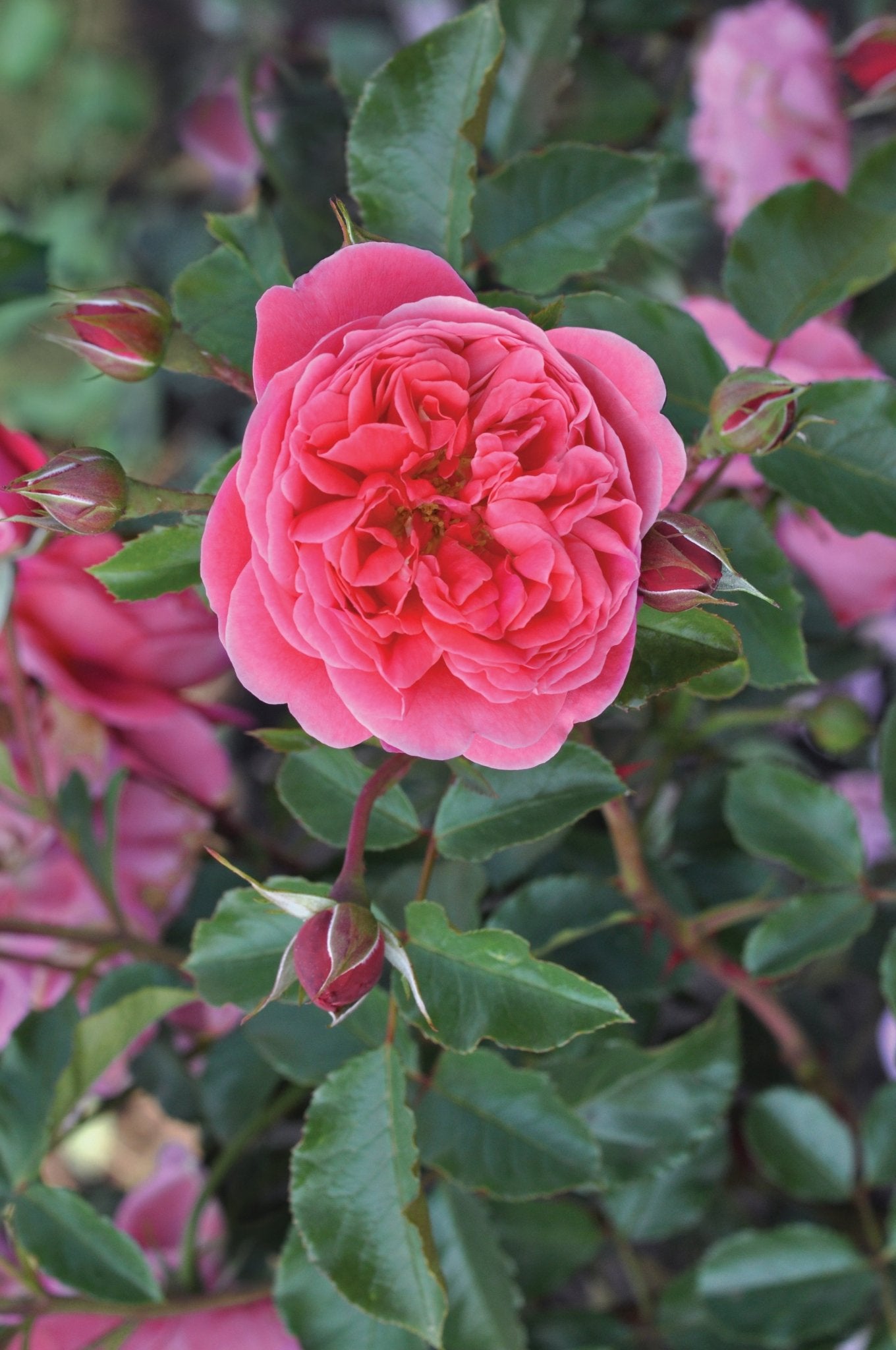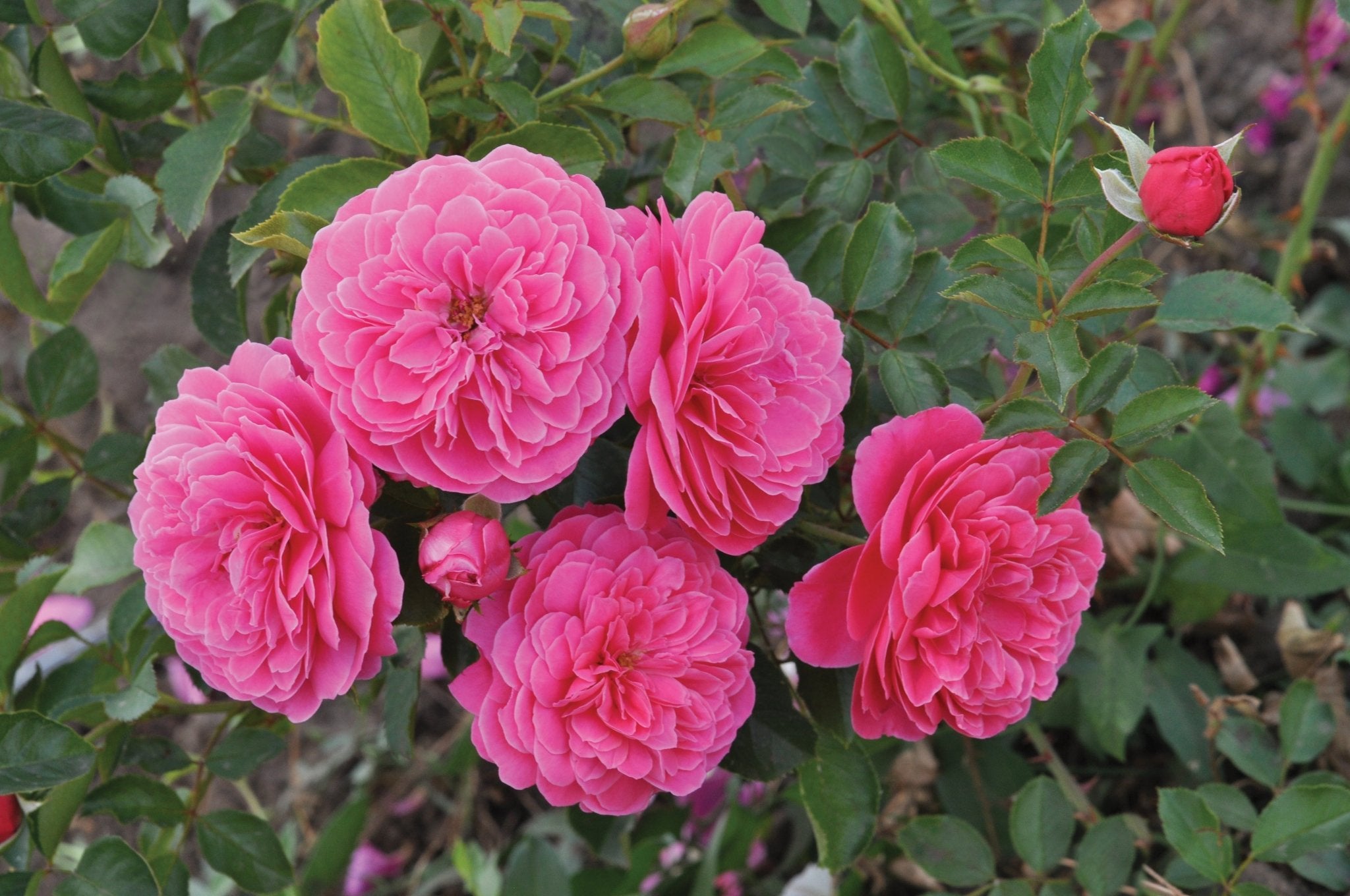 DESCRIPCIÓN VISUAL: Este rosal presenta flores de un color rosa intenso con un ligero matiz frambuesa. Las flores son grandes, dobles y con un aroma dulce y afrutado. Las hojas son de color verde oscuro y brillante, y el arbusto tiene un crecimiento compacto y erguido.
