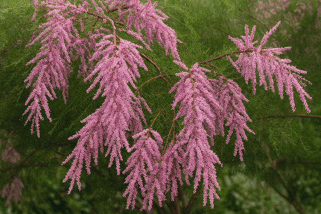 En primavera y verano se cubre de inflorescencias largas y ligeras (espigas o racimos) de pequeñas flores rosadas o blanco rosadas, que confieren a la planta un aspecto vaporoso y elegante.