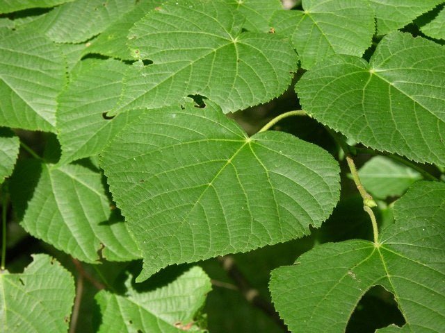 HOJA: Caducifolio. Las hojas miden 5-12cm de largo, son acorazonadas, algo asimétricas y serradas.