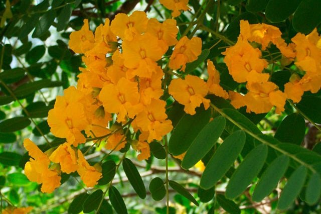 DESCRIPCIÓN VISUAL: Árbol de gran tamaño con copa amplia y redondeada. Hojas compuestas de color verde brillante y flores amarillas en racimos.