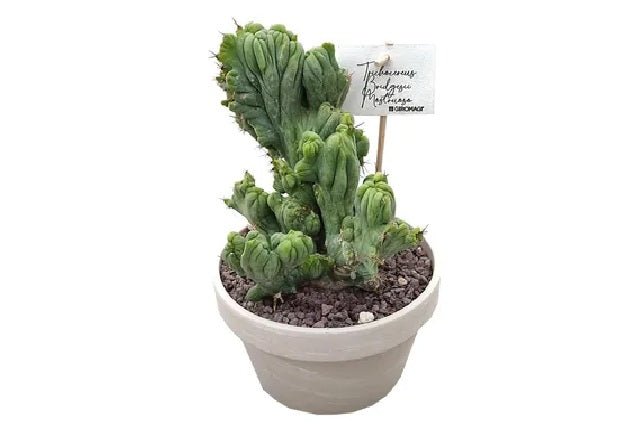 DESCRIPCIÓN VISUAL: Cactus de crecimiento columnar con una mutación cristata que provoca un crecimiento ondulado y fascinado en la punta. Presenta un color verde azulado y espinas cortas y afiladas.