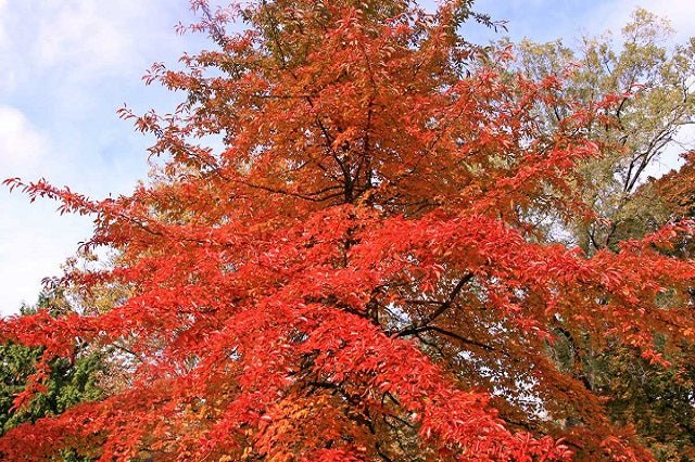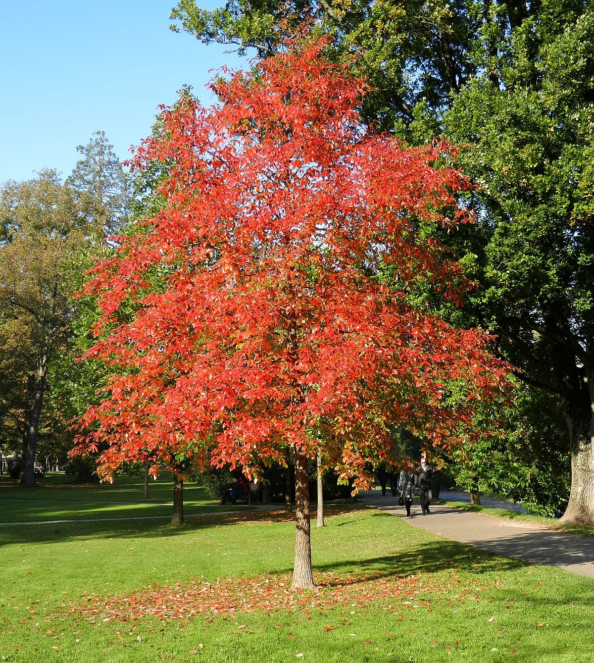 DESCRIPCIÓN VISUAL: Árbol de hoja caduca con una copa ovalada y hojas que cambian de verde a rojo brillante en otoño. Produce pequeñas flores y frutos azul-negros.