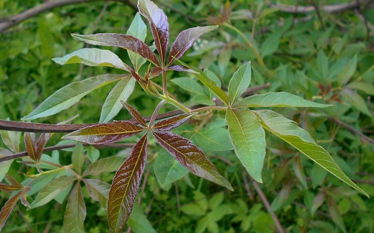 DESCRIPCIÓN VISUAL: Arbusto o pequeño árbol con hojas compuestas de tres foliolos de color púrpura oscuro. Produce pequeñas flores de color azul pálido o lila en densas panículas.