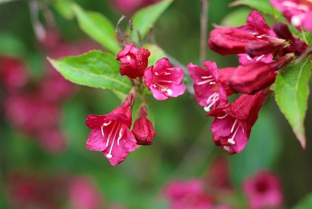 DESCRIPCIÓN VISUAL: Arbusto caducifolio con ramas arqueadas. Hojas ovaladas de color verde. Flores en forma de campana, rosadas o rojas, agrupadas en racimos.