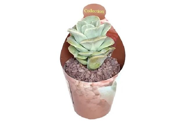 DESCRIPCIÓN VISUAL: Planta suculenta con hojas carnosas dispuestas en rosetas compactas que recuerdan a una rosa. Las hojas son de un color verde azulado con tonos rosados en los bordes, especialmente cuando se exponen a pleno sol.